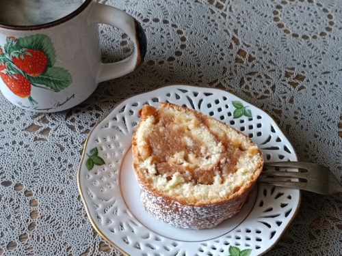 Võta plaat ahjust. Kata kook küpsetuspaberiga, pane peale teine ahjuplaat ja keera ringi. Nüüd keera kook rulliks ja jäta jahtuma.